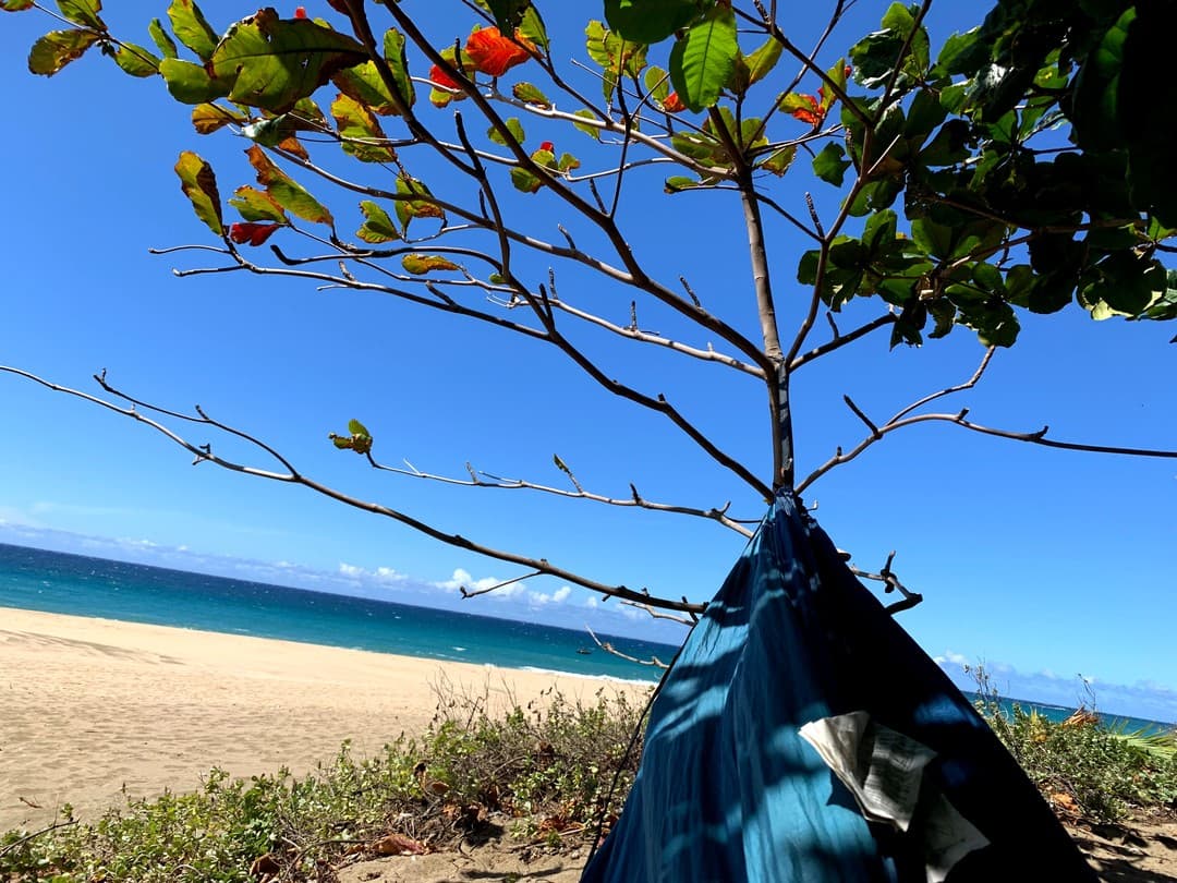 I packed everything I needed, opting to sleep in sweats in a hammock with a sleeping bag liner rather than a tent with a sleeping bag to lighten my carrying load. I had everything I needed except a hot water heater, which I’d need to procure to make food for me and Eevee every day. I was told there were many friendly people on Kalalau beach who would kindly lend me some water.